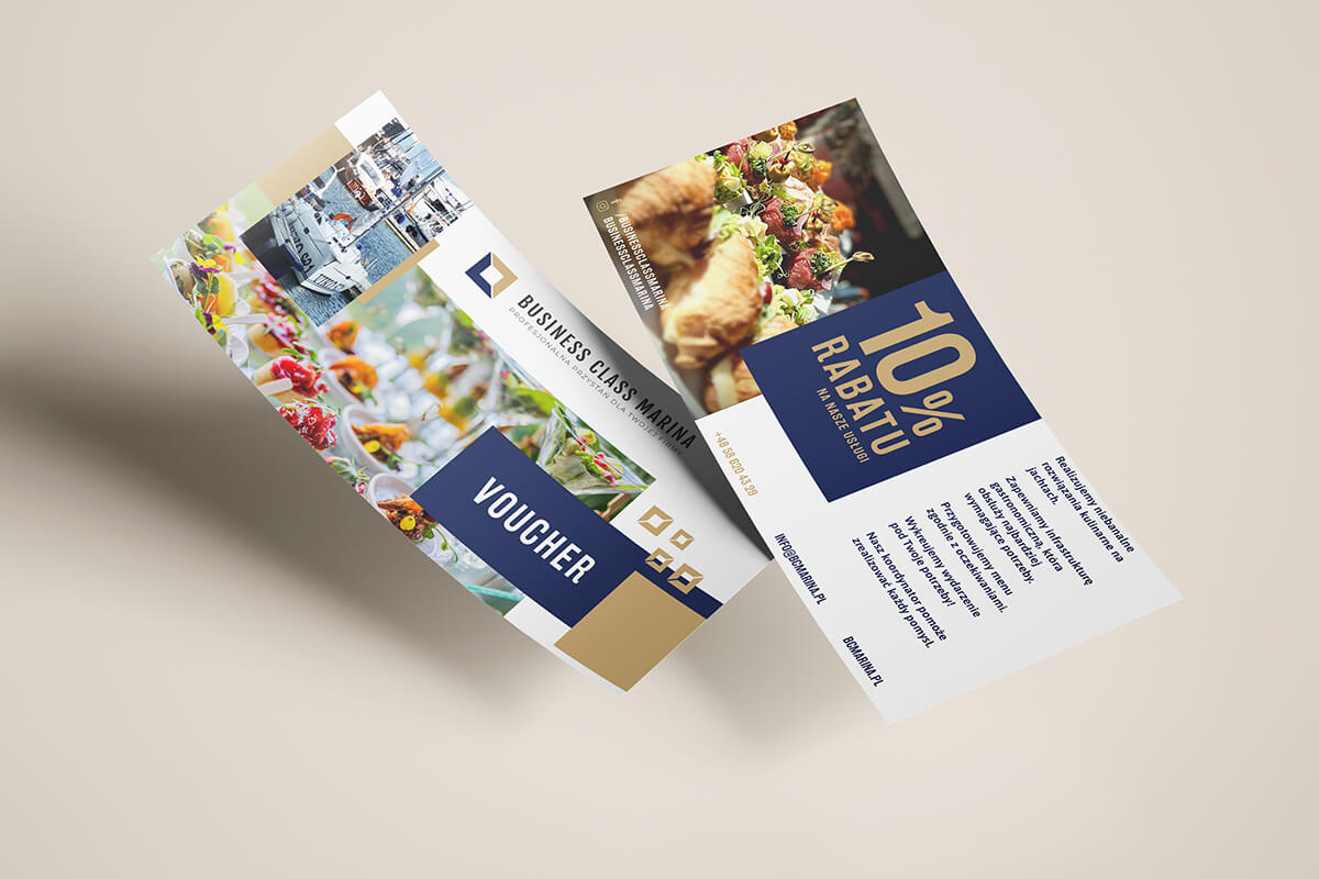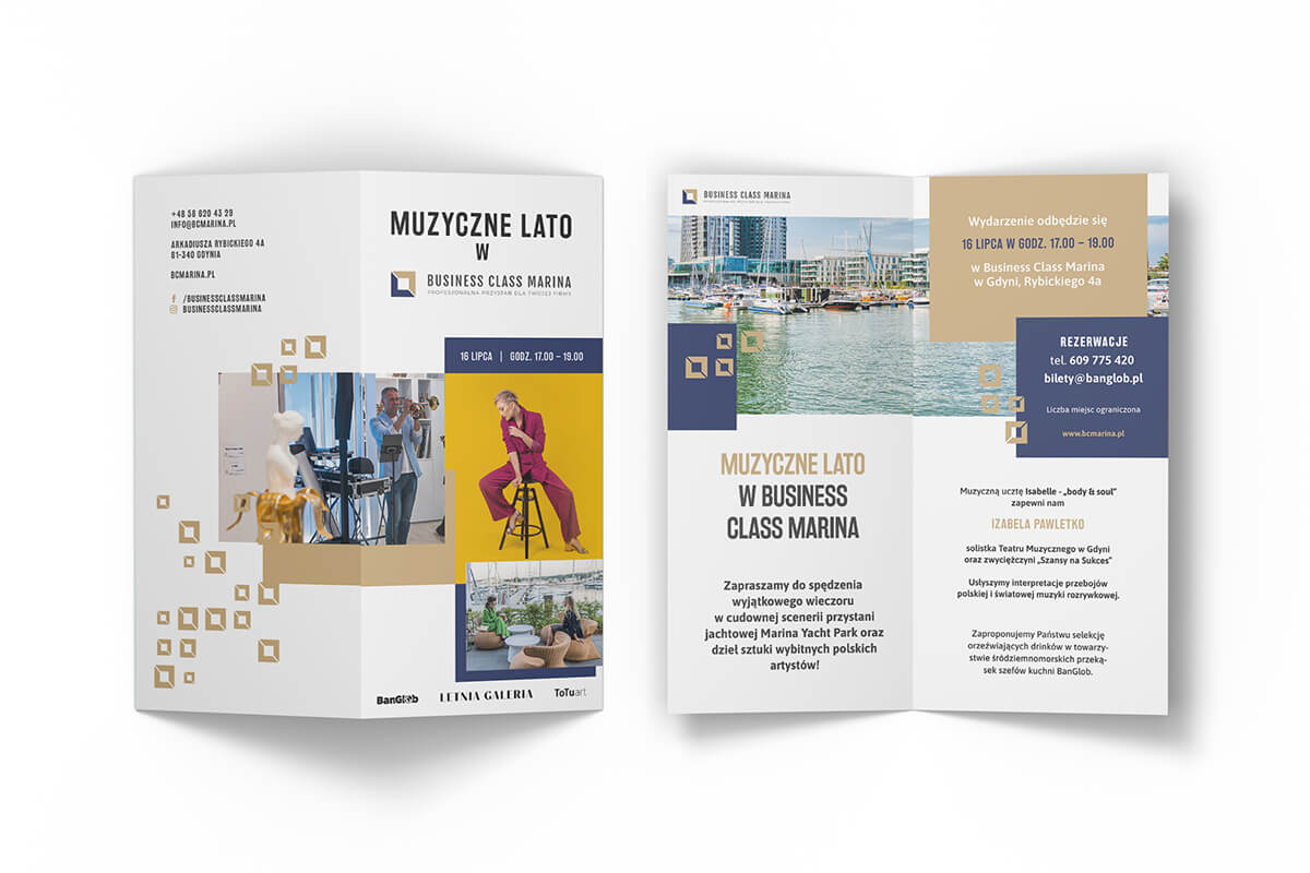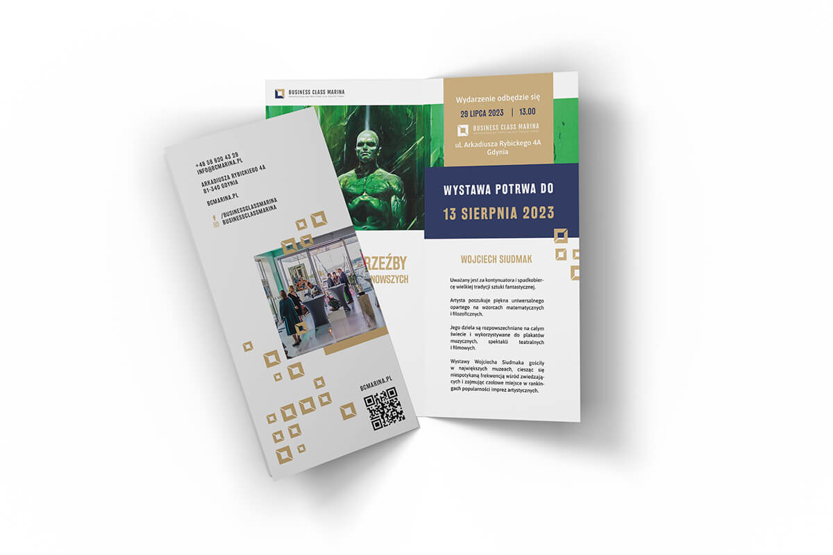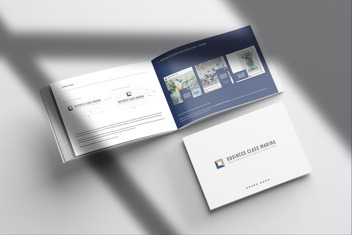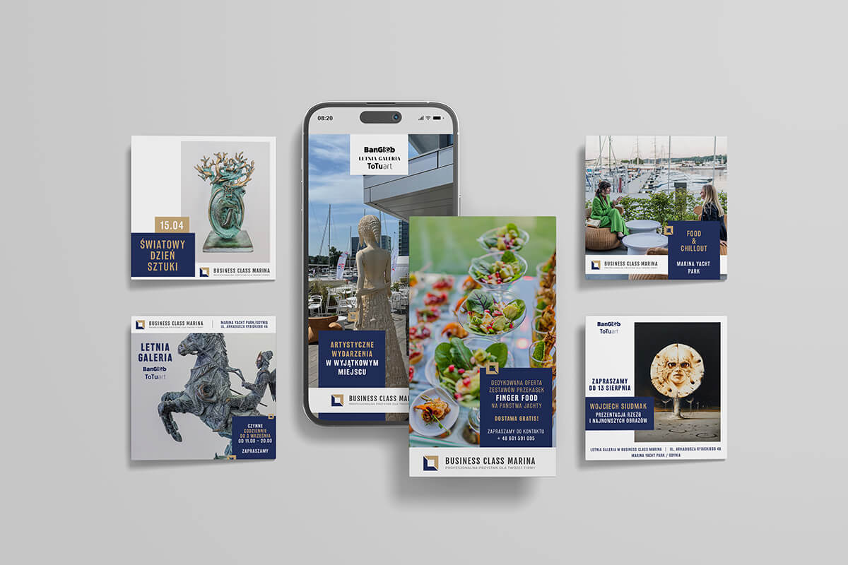 Klient dysponował wysokiej jakości materiałami fotograficznymi – zarówno zdjęciami wnętrz, jak i artystycznymi ujęciami dzieł sztuki prezentowanych w przestrzeni Business Class Marina. Kluczowe było więc dla mnie stworzenie identyfikacji, która nie przytłoczy tych obrazów, a raczej je dopełni – elegancko i nienachalnie.